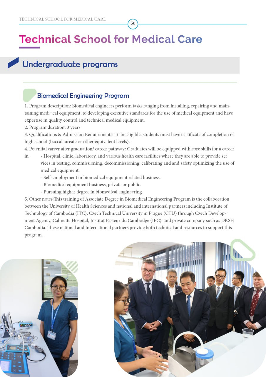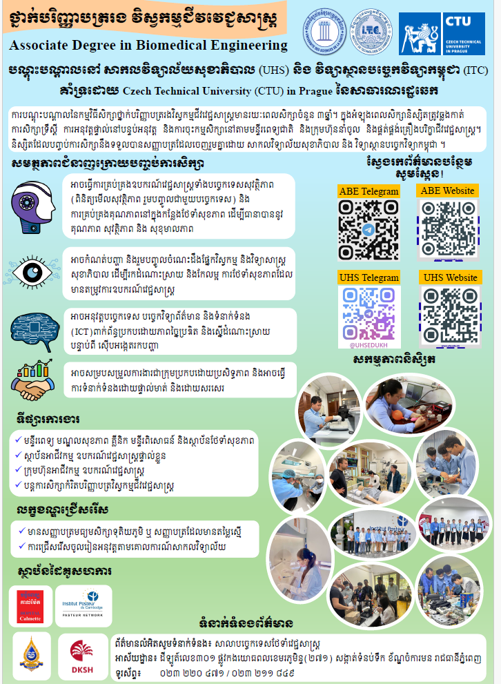 The University of Health Sciences (UHS) and the Institute of Technology of Cambodia (ITC) jointly offer the Associate Degree in Biomedical Engineering, a re-accredited and modernized 3-year study program that equips students with both theoretical and practical knowledge across medicine, biology, physics, and engineering.